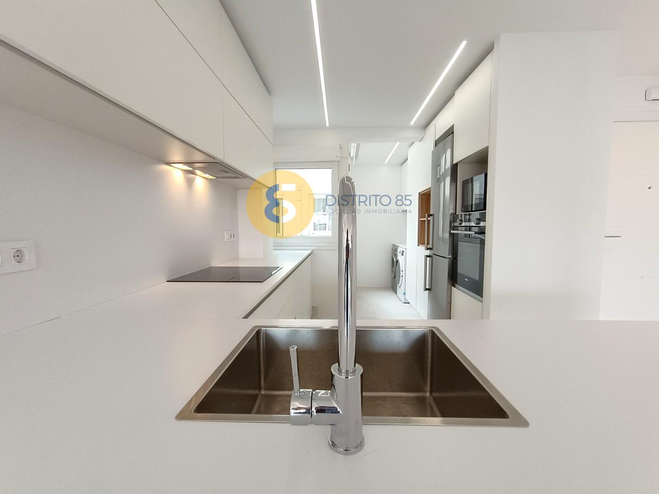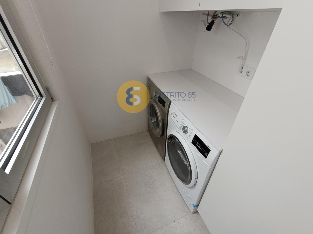 Cocina abierta a salón con todos los electrodomésticos y zona de lavandería.