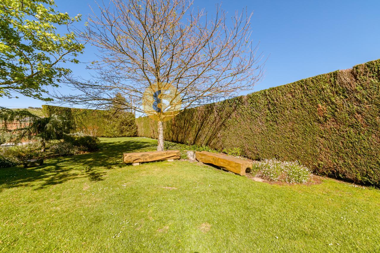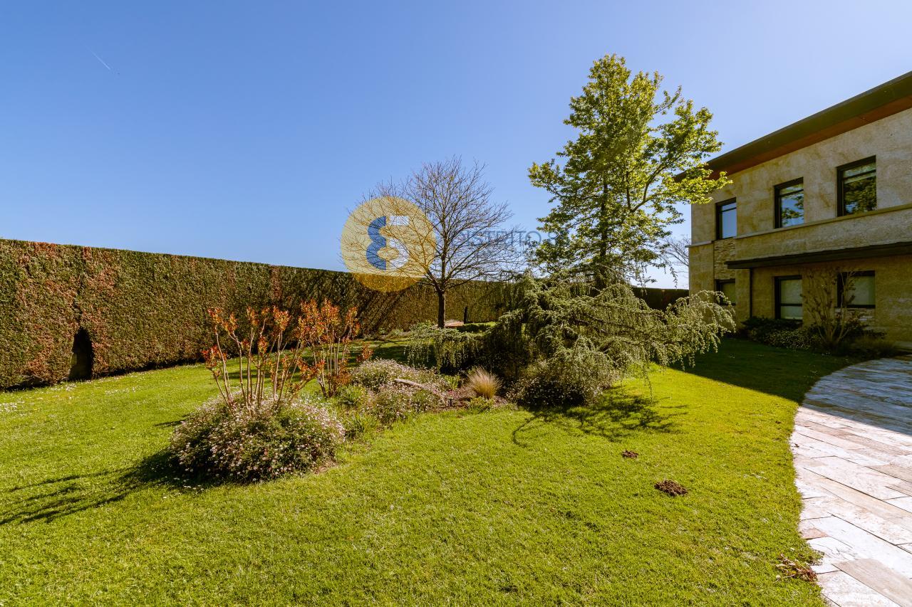 El jardín es totalmente llano. En él podemos disfrutar de una piscina climatizada de agua salada (dispone de sistema de autolimpieza "net and clean"), múltiples zonas verdes y diferentes árboles, que van desde un Castaño, un Cedro, un Roble e incluso árboles japoneses.